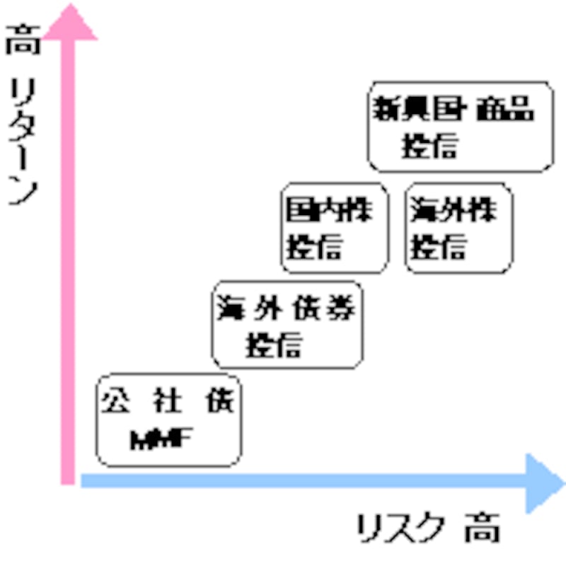 図のように、短期金融商品や国内債券で運用しているMRFやMMF、公社債投信がローリスク・ローリターンに一番近く、海外債券で運用しているものは為替によるリスクが加わるので少し変動幅が大きくなります。