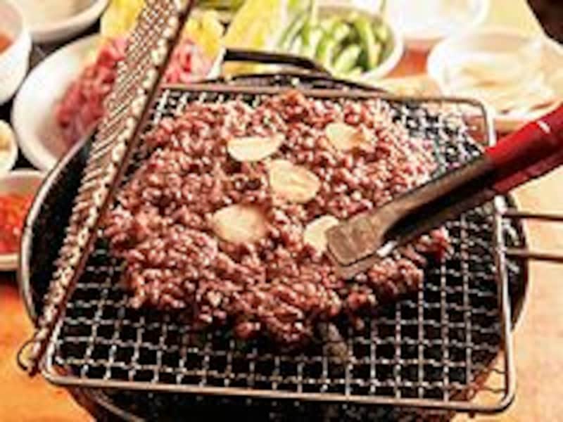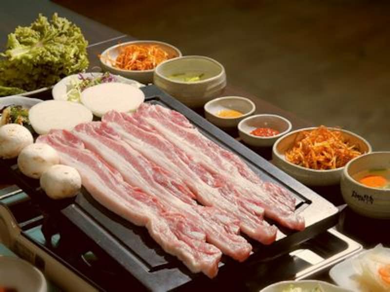 豚の三枚肉を使った焼肉のこと。下味を付けたサムギョプサルを鉄板で焼き、岩塩入りごま油やサムジャン(味付け味噌)につけ、にんにくやキムチと一緒にサンチュで包んで食べるのが美味しい食べ方です。最近ではワインや緑茶、ハーブなどで下味付けをしたサムギョプサルも大人気。適度に柔らかく香ばしいお肉は、口に入れると舌にじゅわっと肉汁が広がり、まさに激ウマ。