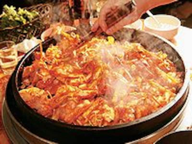 ぶつ切りの鶏モモ肉とキャベツ、サツマイモ、トック(餅)、にんにくなどをコチュジャンで絡めながら円形の大きな鉄板で炒めた料理。江原道、春川市の名物料理として有名です。一般的に味は辛目。でも、辛いのが苦手な人は、注文するときに「あまり辛くしないで下さい。(トル メプケ ヘジュセヨ)」と一言いうと、辛さダウンで調理してもらえます。8割方食べた辺りでちょっと休憩し、ごはんを注文しましょう。店員さんが、残ったダッカルビの具材とごはんをゴマ油で炒めてチャーハンにしてくれます。