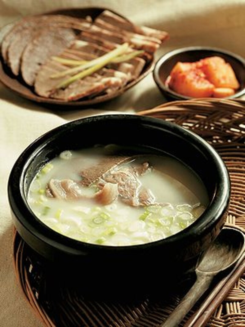 牛骨や内臓などを10時間以上じっくり煮込んだスープ料理で、中に素麺と肉片が入っています。味付けはほとんどされない状態で出されるので、塩コショウや唐辛子粉などを好みで入れます。カクトゥギ(大根のキムチ)と併せて食べるのが美味しいですよ。