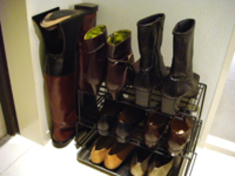 | 冬場のロングブーツはキーパーを使って定位置(左端)を確保。梅雨時のレインシューズはラックに置けば乾く |