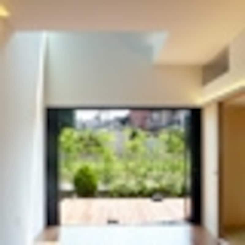 前面道路から伸びるのは大理石の細長いアプローチ。以前紹介した佐藤宏尚さんの[SHIENA]という住宅を見て建て主が気に入り、リクエストしたそうです。この大理石は玄関フロアまで続いていました。アプローチの脇の約12坪の前庭には、10畳の広さをもつウッドデッキのテラスが置かれています。植栽とテラスの間は将来、家庭菜園として活用されるそうです。