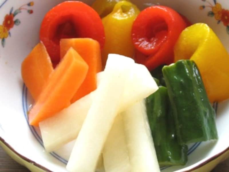 - ボウルに2の野菜を入れ、上から1のピクルス液をかける。冷蔵庫に約2時間おいて完成。