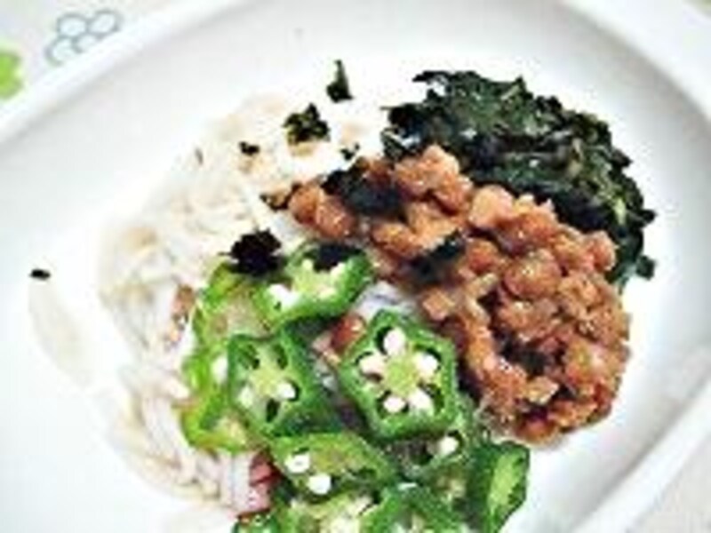 2、茹でた麺の上に納豆、1を盛り付け、だし汁で薄めためんつゆをかけます