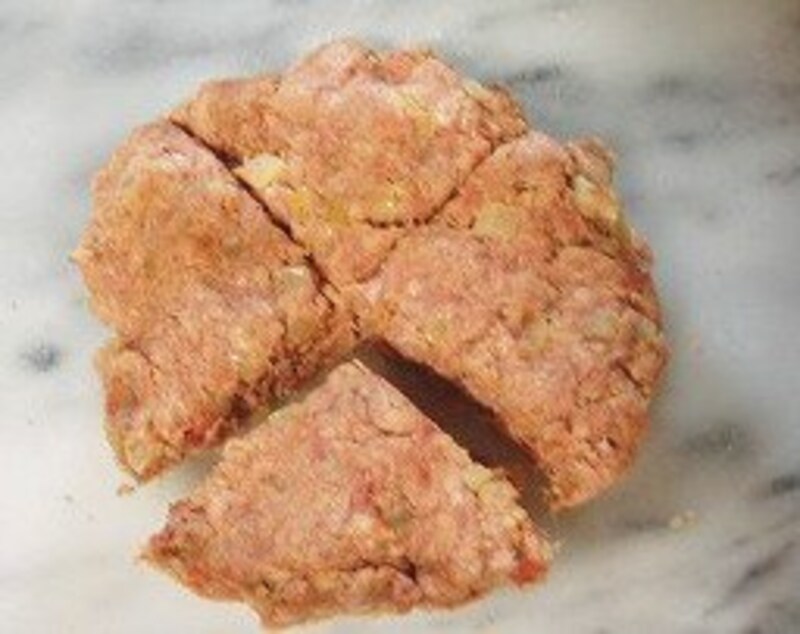 4.3に、2の玉ねぎ、塩(適宜)、片栗粉を加えて混ぜ、最後に1を加え、良く混ぜ4等分する。