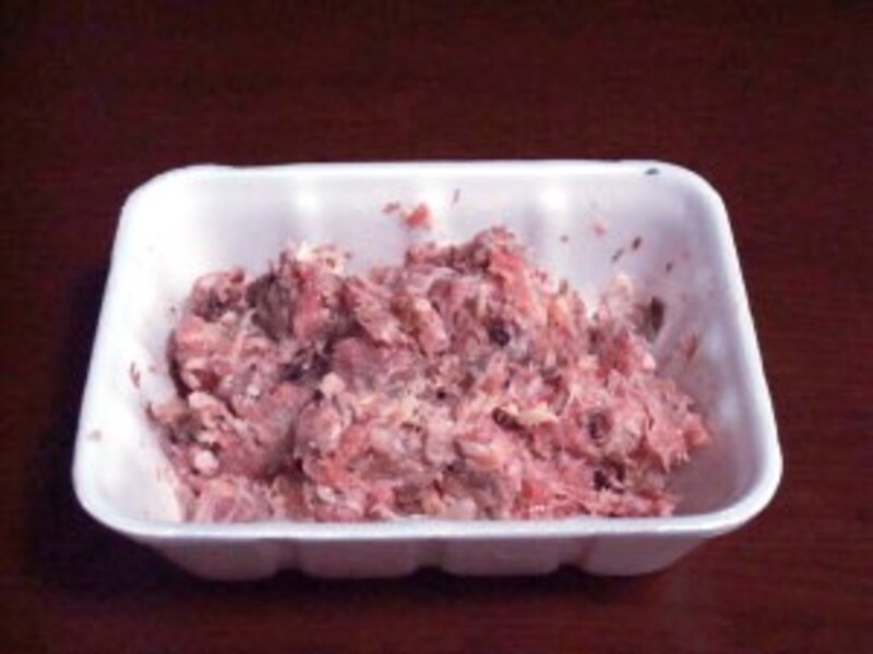3.鶏ひき肉、鯖缶(骨を取り除いてほぐしたもの)を良く混ぜる。