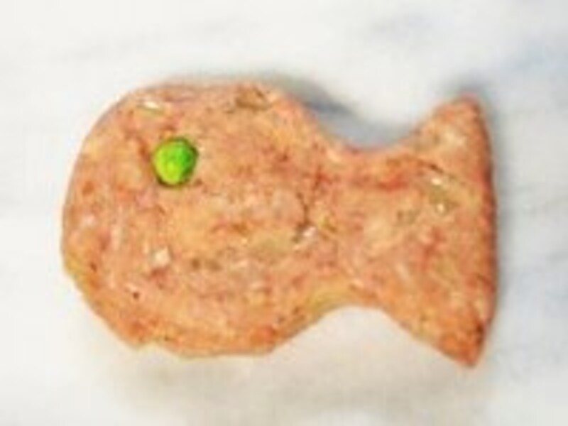 5.4で出来た生地を魚の形に整え、グリンピースを目の位置に両側からつける。