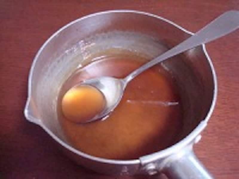 7.小鍋にだし汁、みりんを入れひと煮たちさせてアルコール分をとばした後、しょうゆで調味し水溶き片栗粉でとろみをつける。