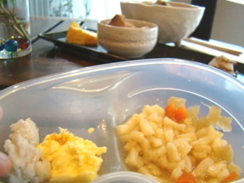 けんちんうどんが、下の写真のような離乳食になります。主食、野菜、タンパク質が揃ったバランス食。今回は7~9ヶ月頃の赤ちゃん向けですが、それ以外の月齢でも、応用可能です。