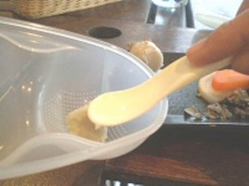2.ピジョン「ママッシュ」の小さい部分に入れて、付属のスプーンでつぶします。(6ヶ月頃の場合は、お湯を少々足すといいでしょう)。