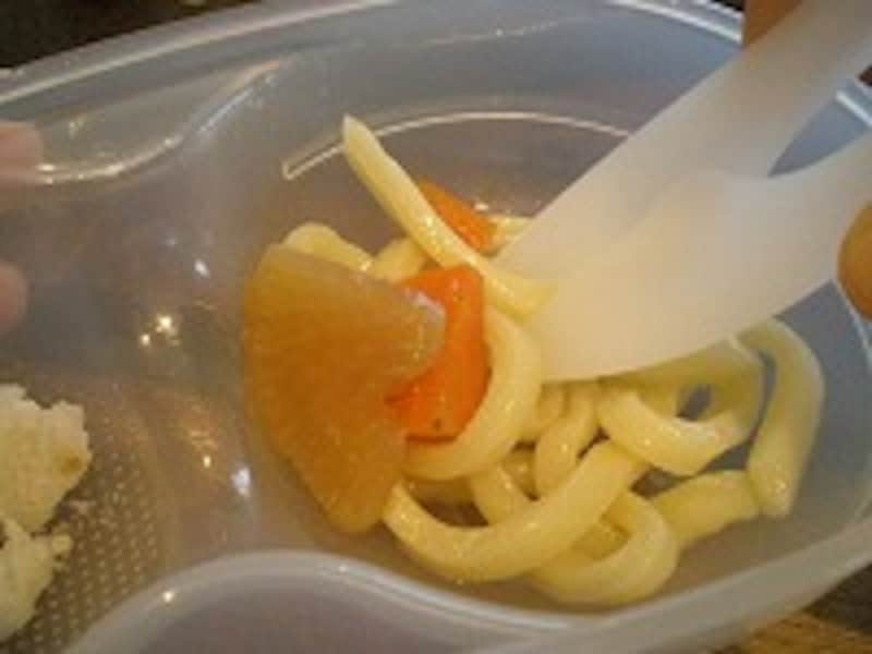 4.うどん3本とにんじん、大根をママッシュの大きい部分に取りわけ、コンビ「ヌードルカッター」で細かく切ります。