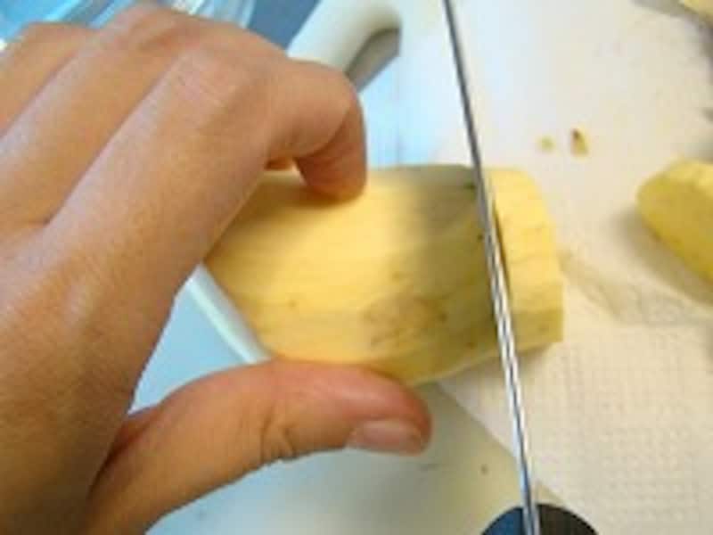 1.皮むき器や包丁などで皮を少し厚めにむきます。皮むき器の場合は、厚めにむけないのでご注意を。