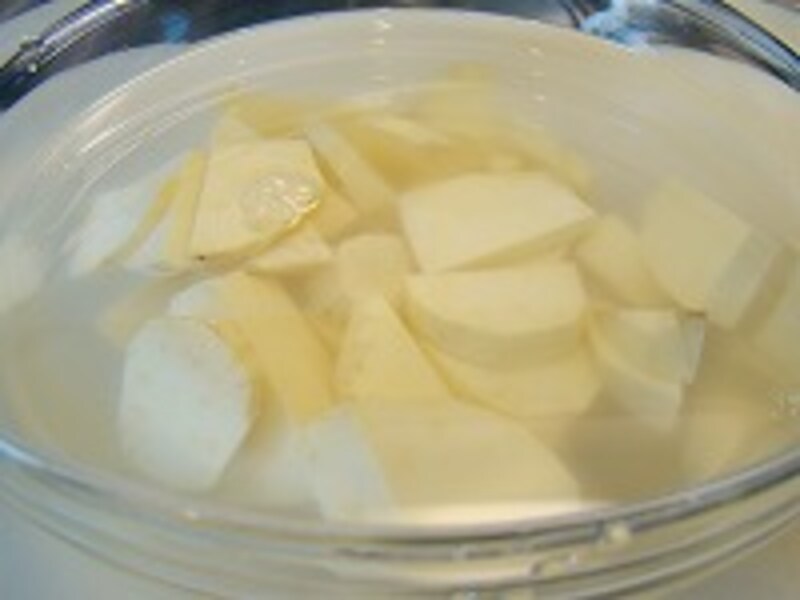 3.水をはったボールに、2のさつまいもを1~2分ほど浸してアク抜きします。アクは皮の近くにあるので、皮を厚めにむけばアク抜きの時間は少なくてOK。