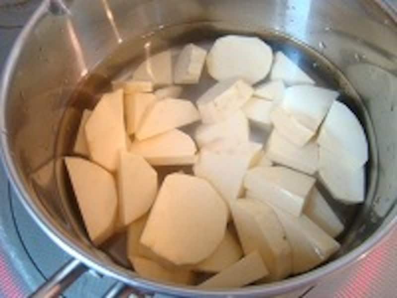 4.鍋に3の水を切ったさつまいもと、ひたひたの新しい水をいれ、蓋をして約10分ほど煮ます。