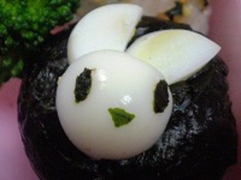 4.1で出来た小さい方の卵(卵の上の方)に海苔で作った目と口を貼ります。