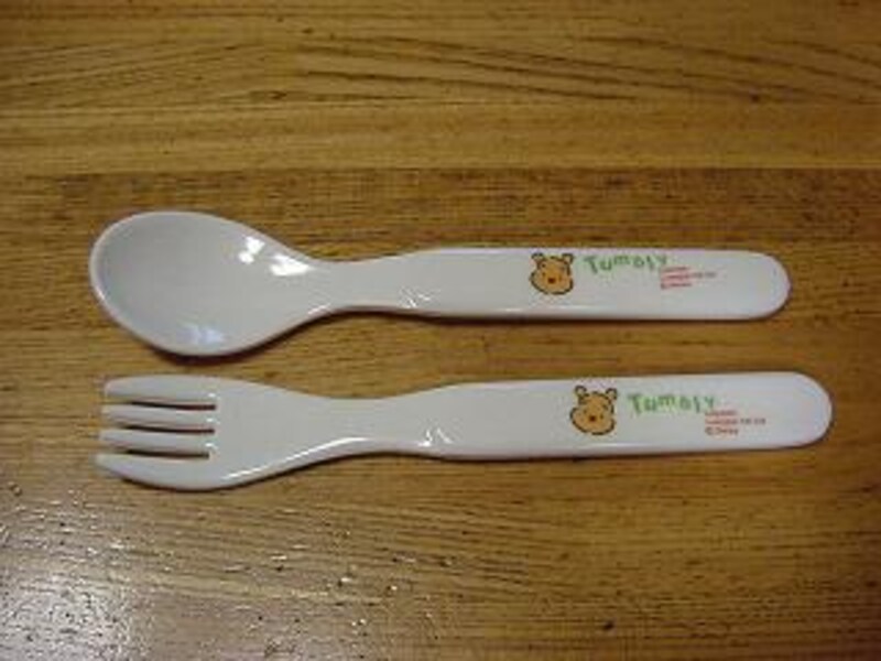 柄が長いものは、ママが食べさせやすいかも。赤ちゃんも持ちたがる場合は、もう1セット用意。(スプーン&フォークで100円です)
