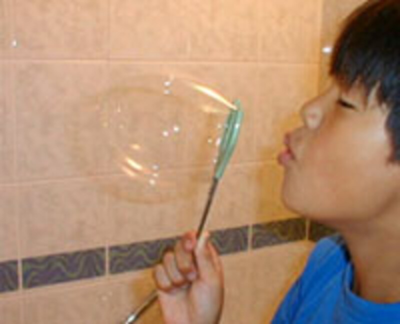 ゆっくり吹くと、かなり大きなシャボン玉ができます。そして、ペットボトルを振ると、丸くなって、飛んでいきます。