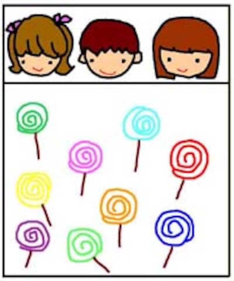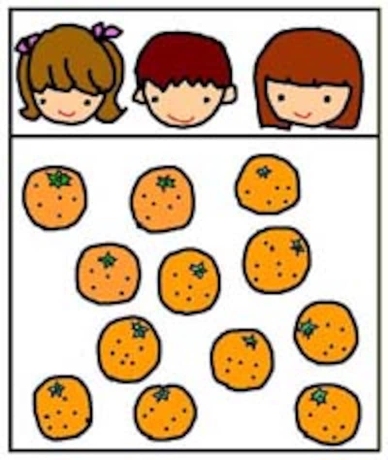 ■■ 「数の分割」の問題例 ■■下の食べものを上の子ども達が同じ数ずつ、仲良く分けます。1人分はいくつになりますか。その数だけ、右の箱の中に○を書きましょう。この問題の考え方は>次のページです。前のページへ123…5次のページへ