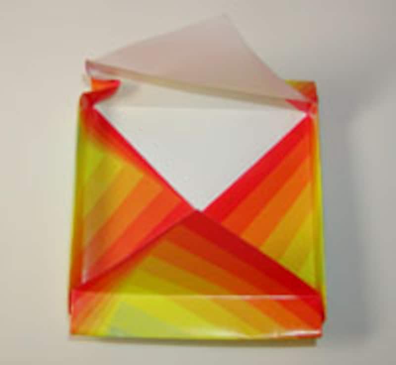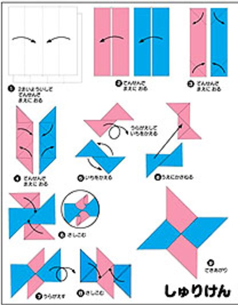 「おりがみくらぶ」の「あそぶおりがみ」の「ふうせん」と「しゅりけん」を組み合わせて作ります。折り紙の1辺を4分の3の長さ(約11cm)の正方形にしたものでふうせんを折ります。しゅりけんを図のように中に折り込んでいき、「ぼんぼり」のスタンド部分を作ります。
