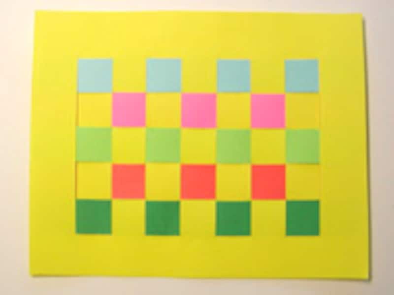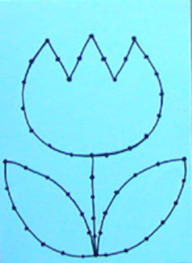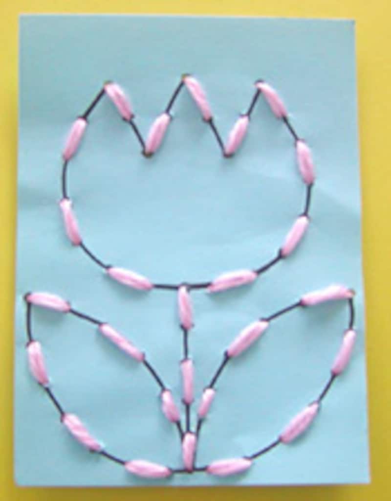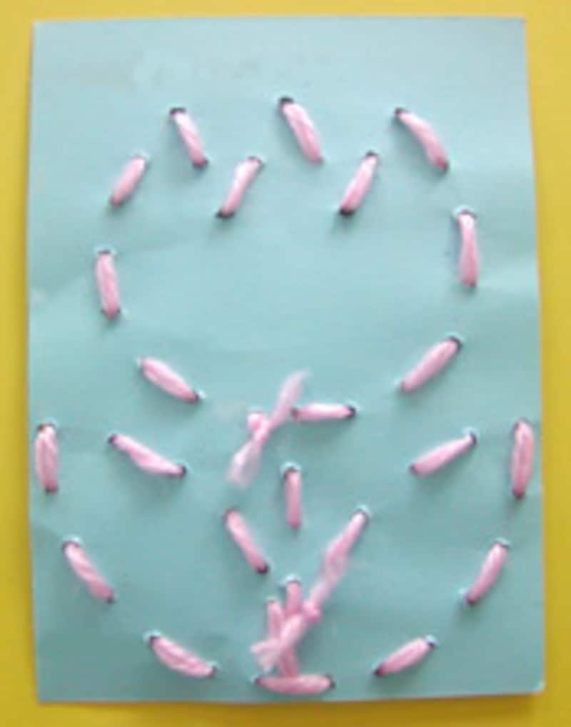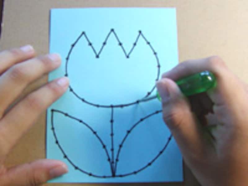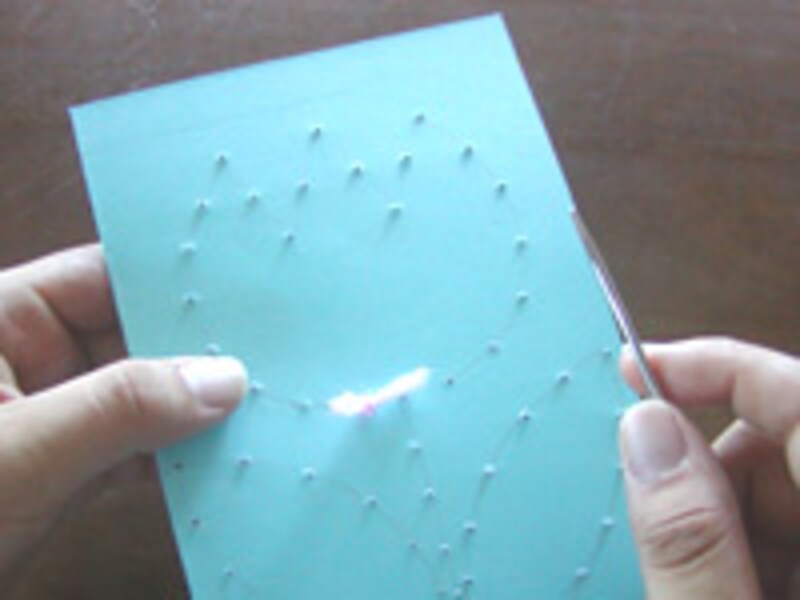 ・図案の描かれた色画用紙を裏返し、裏側の穴から針を通す
