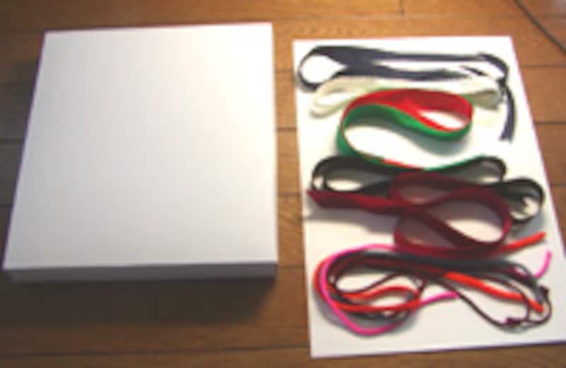 ・白い箱に切り込みを入れ、リボンや紐を左右に固定する