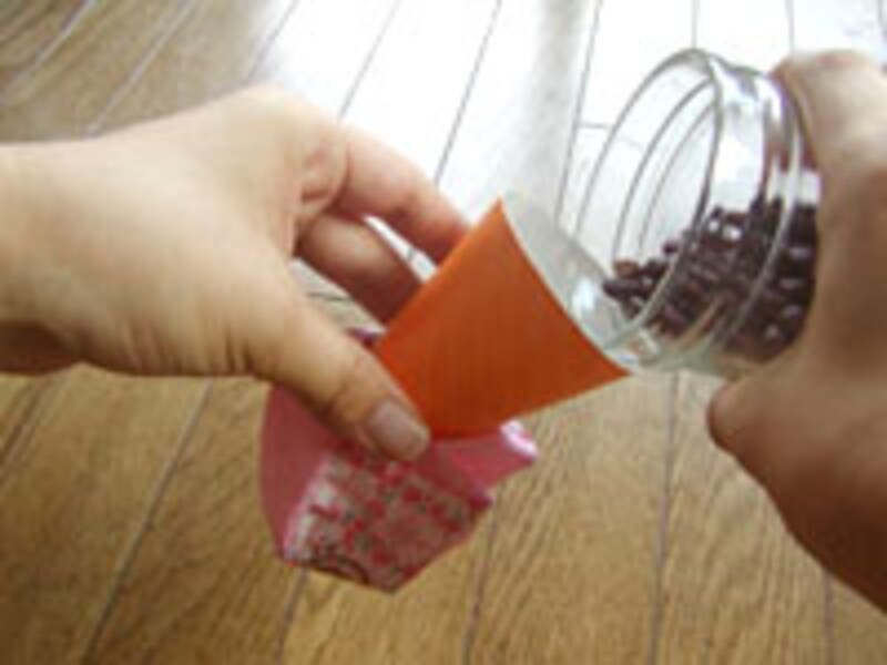 お手玉の布を表替して、じょうごを使い、小豆を40g入れる。