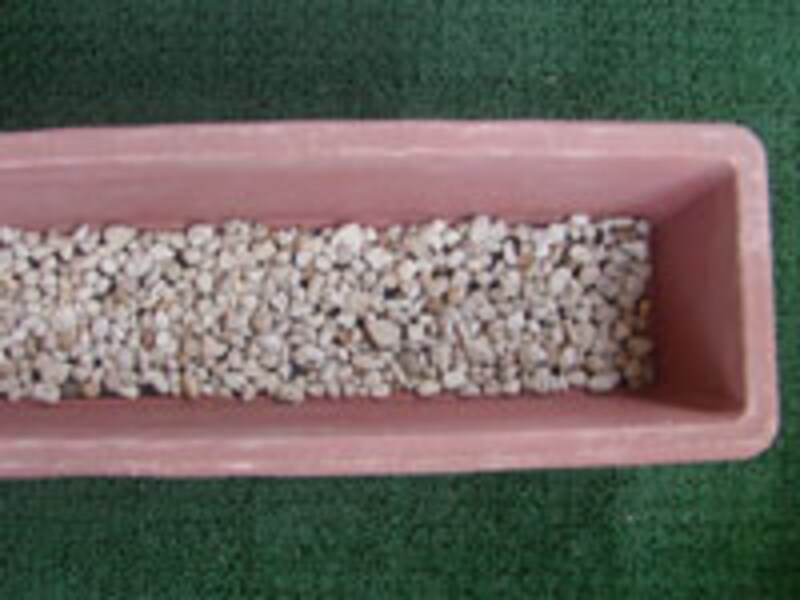 ・その上に、鉢底石を底から約2cmほどの高さまで敷く(鉢の中の通気性・排水性をアップさせるため)