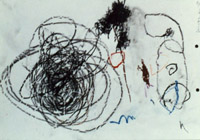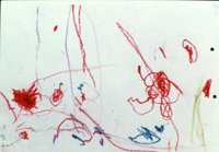 初期のなぐりがきは、鉛筆やくれよん を握って紙をたたいているうちに点や 短い線が描けるといったもの |