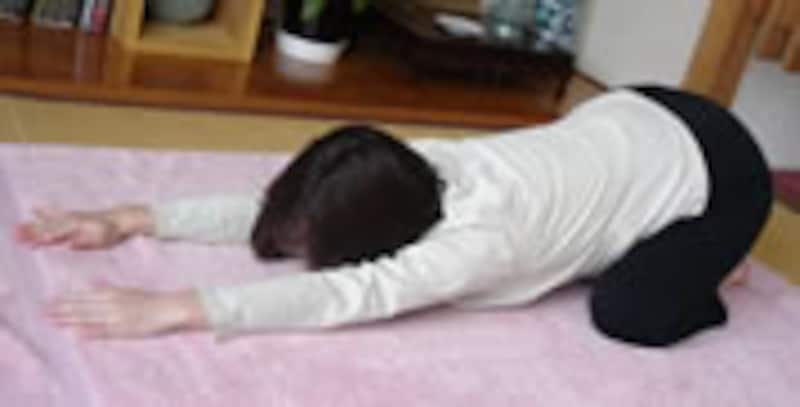 この「猫の体位」「猫の伸びの体位」は、誰にでもできて背骨をしなやかにしてくれます。妊婦さんにとっては、お腹が逆さになる部分が逆子直しのポーズとして有名ですね。陣痛のきつい時を乗り切るにもおすすめのポーズです。