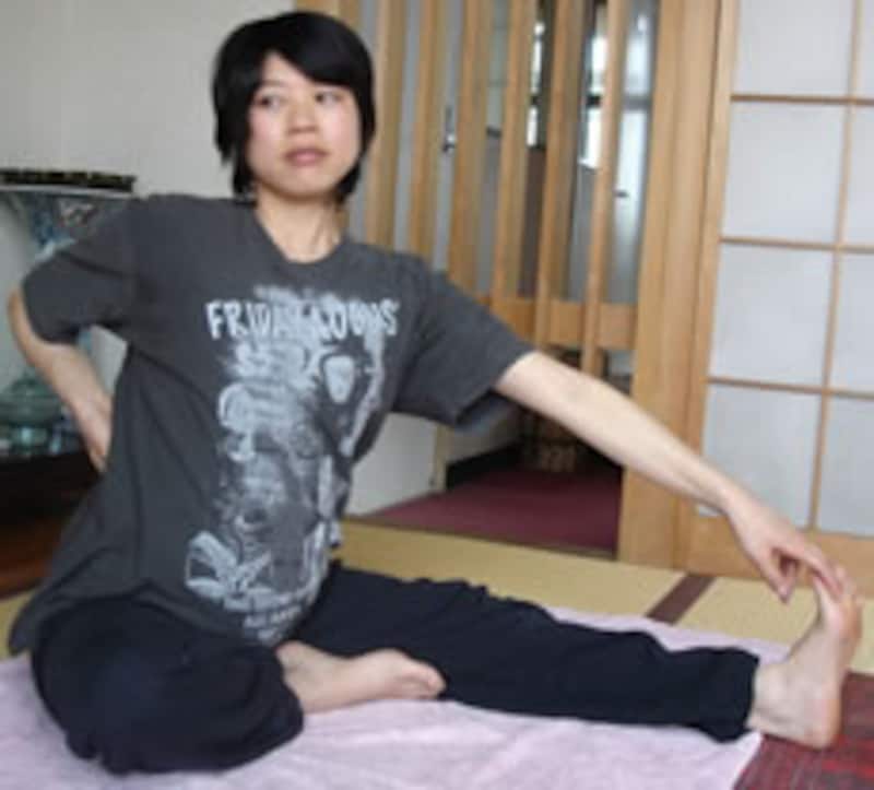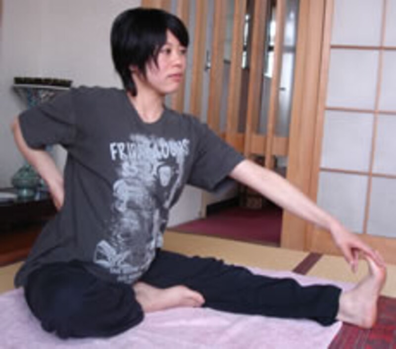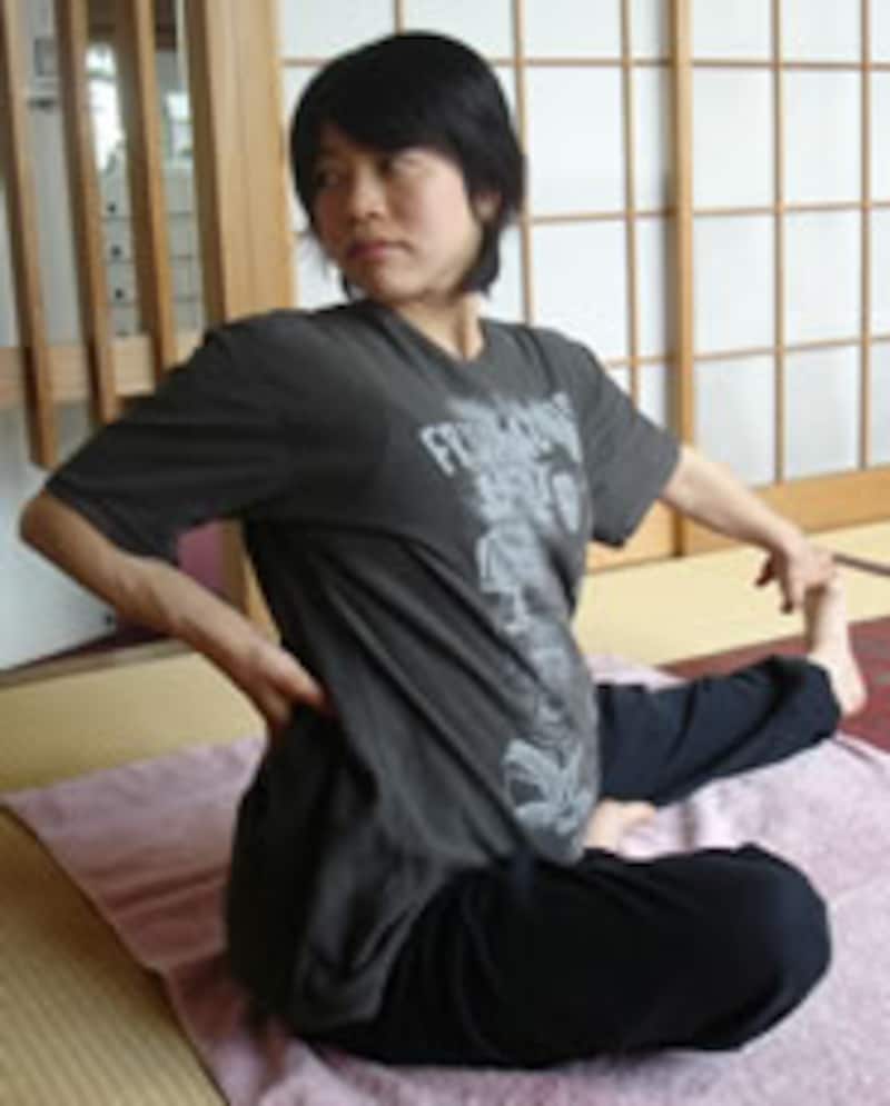 しっかりねじることで、背骨を矯正するポーズです。そして、脊椎を通る「気」の通りをよくします。「気」は四次元的エネルギーなので理屈ではわかりにくいですが、ポーズをしてみれば、終わったときに直感的な「通った」という感じがすると思います。妊娠中は大きなお腹に押されて、気の通りが悪くなり、循環が悪くなります。そして便秘につながります。