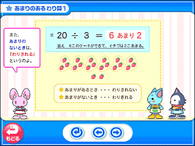 3年生になると、あまりのある割り算が登場しますが、 それ以前の学習範囲であるかけ算がしっかりできていないと、あまりのある割り算でつまづくことになってしまいます。「すきすき算数小学3年」は、かけ算と割り算に多くのアニメーション解説・問題を設け、ソフトのなかに何度もかけ算・割り算が登場するのがポイントです。 問題でつまづいた場合には丁寧なヒントも参考にできるので、苦手克服にも大いに役立ってくれるでしょう。