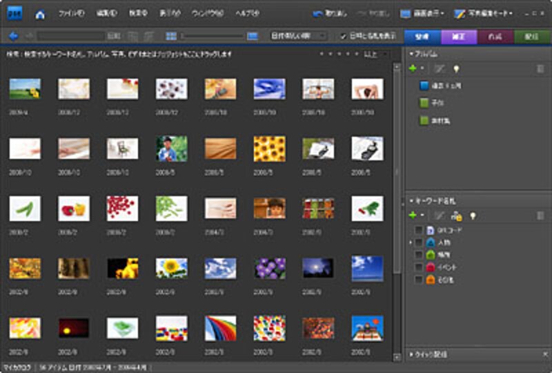 デジタルカメラの保存容量増加に伴い、一度に何百枚単位で写真を撮るという方も珍しくなくなりました。 また、家族がそれぞれデジタルカメラを所有している場合も、写真の整理は気が遠くなるものになりがちです。そこで活躍するのがAdobe Photoshop Elements 7の写真整理モード。 アルバムごとに写真を整理できるのはもちろん、写真ごとに名札を付けておくこともできます。 写真は、名札や日付、キーワード情報などから検索することができますから、 複数のアルバムに入った大量の写真から簡単に1枚の写真を探し出すことができるのです。