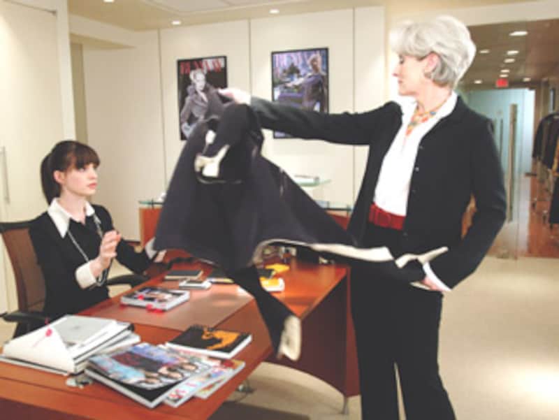 | ミランダ鬼編集長(メリル・ストリープ)に、毎日コートを投げつけられるアンディ(アン・ハサウェイ)。寝るヒマなし。ランチのヒマなし。プライベイトなし。アシスタント稼業は辛いね・・・。 |