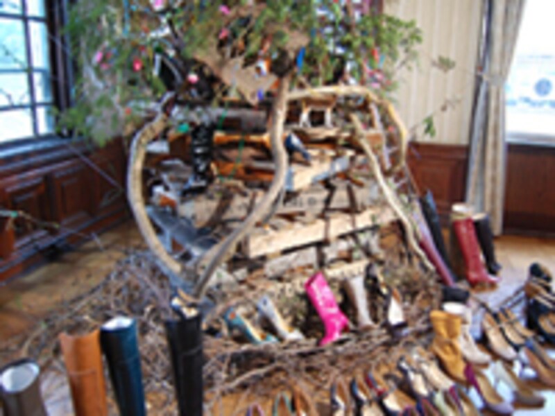 新作のシューズとともにディスプレーされたメインオブジェは、絡み合うようにツルや木々が生い茂り、木々の先にはネオンカラーの人工物を装飾。このオブジェが意味するものは、幻想の世界での安らぎ。自然の木々に感じるあたたかさと、自然とは相反する人工物とカラーが、切なさや儚さを表現しています。