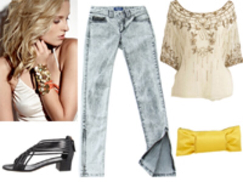 | (左から)ペイント加工スキニーデニム \29,400(税込)/CURRENT/ELLIOTT (マナマナ) スキニーデニム \45,150(税込)/superfine(マナマナ) グラディエーターサンダル \108,045(税込)/GIUSEPPE ZANOTTI DESIGN(Javari.jp |
