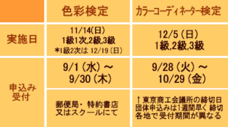 検定試験の申込み締切りは、「色彩検定」は9/30(木)、「カラー検定」は東京商工会議所は10/29(金)です。締切間際は込み合います。余裕を持って、お申込みはお早めに!