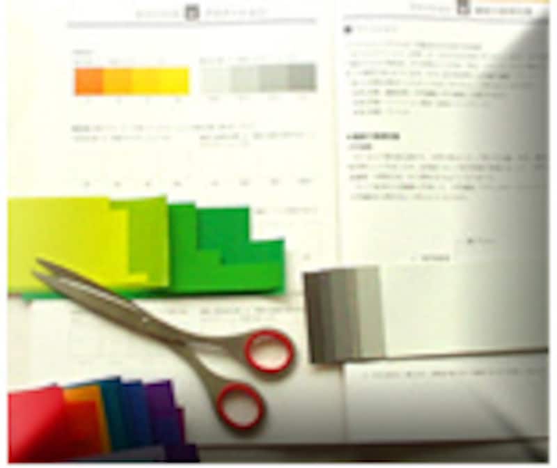 「色彩検定」3級、2級公式テキストには、配色見本の下にカラーカードを切り貼りするスペースがあります。所定のコマに全部カードを貼り付けてはじめてテキストが完成するというわけ。あなたオリジナルの手作りのテキストの出来上がり!3級、2級の試験は筆記のみでカラーカードは使いません。だから、自宅でゆっくりマイペースで配色演習に取り組むことができます。