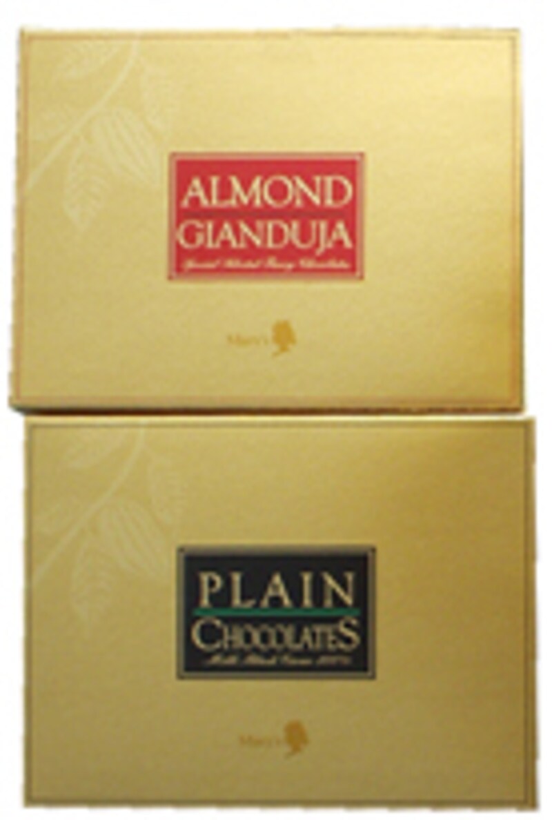 洋菓子ブランド「Mary(メリーチョコレート)」も、ゴールドを使っていますが、こちらは赤と黒を合わせてシャープでモダンな感じに。アーモンドは赤、プレーンタイプ=ブラックチョコは黒で、色と中身が一致しています。また、きりりとした直線的なデザインは正統派チョコの証。また、色数が少ないと上品に見え、フォーマルな場に出しても全然恥ずかしくありません。