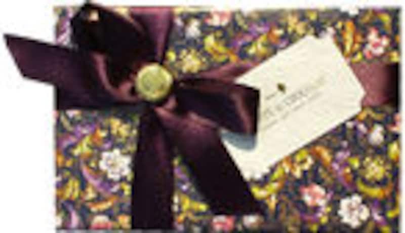 トリュフチョコは形が複雑ですから、シンプルなデザインではちょっとそっけない印象を与えますが、ダークバイオレットを基調とした花柄のラッピングが、複雑で柔和な味わいを演出しています。花柄はケーキなどの洋菓子によく使われ、これほど女性らしさを表すデザインはないでしょう。
