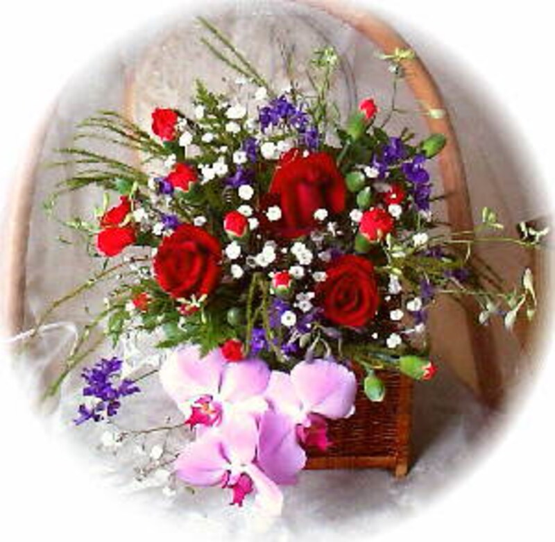 赤系統の花でまとめたフラワーアレンジメント。このくらい数を集めるとバラの赤の美しさを十二分に堪能できますね。