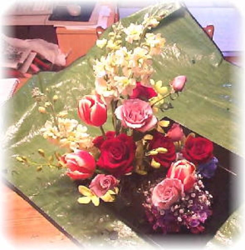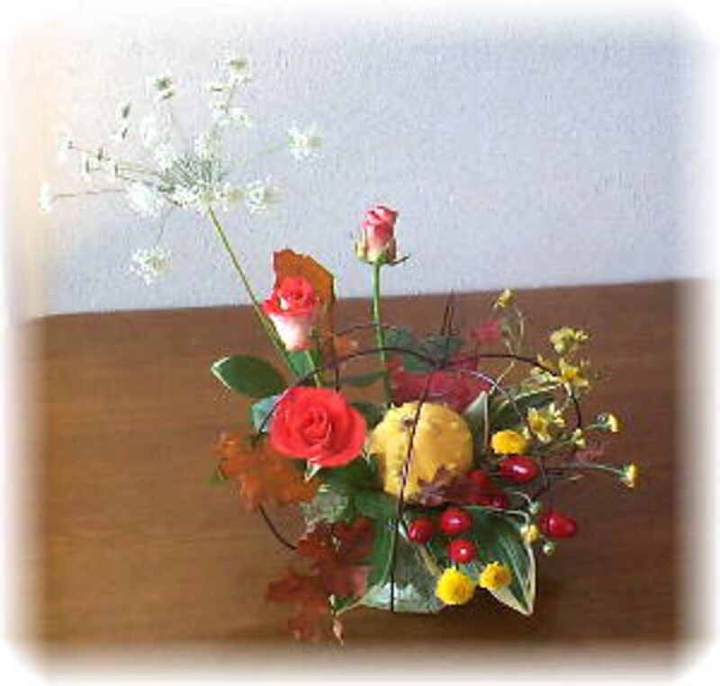 いろんな色をとりまぜています。大きな赤いバラに合わせて、赤いカーネーションの蕾をちりばめています。同じ色を大きさを変えて配置することで統一感がでます。