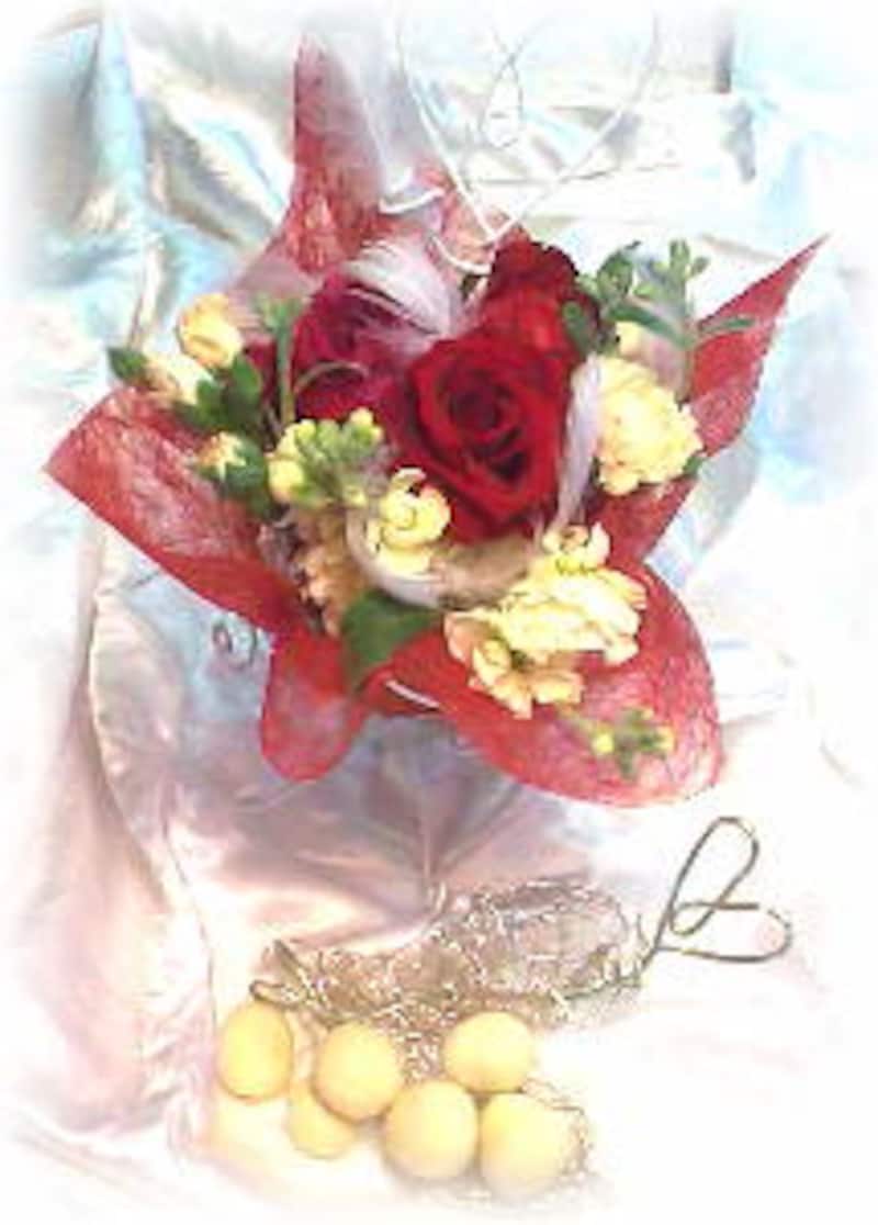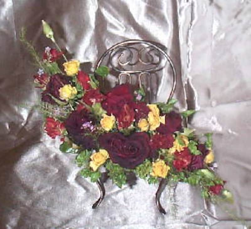赤いバラに合わせて赤いラッピングを、白い花に合わせて白いフェザーを。赤、白、グリーンの3色だけなのですが、素材や形を工夫すればこのように見栄えよく仕上がります。