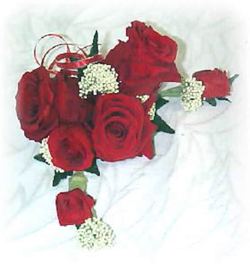 深紅のバラを一塊にしないで流れるように束ねたブーケ。深紅が全体を引き締めています。