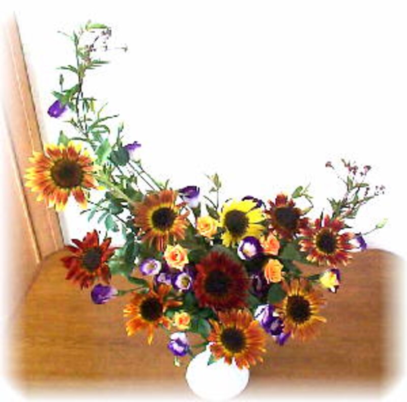 黄色いひまわりでもいいのですが、ブラウンのひまわりにイエローのバラを合わせたところが面白いですね。イエローの反対色である紫の花を配置してお互いの色を引き立てています。