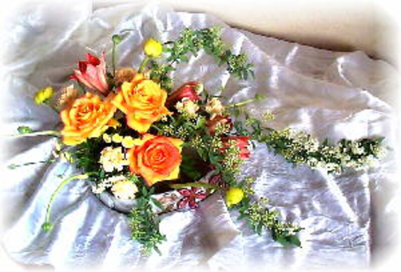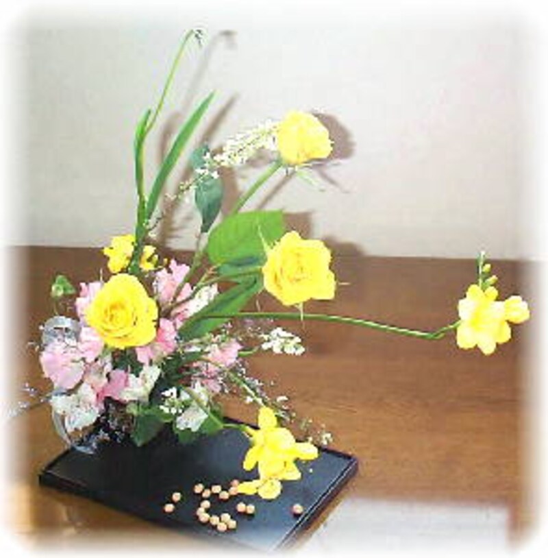 イエローのバラをメインにしたフラワーアレンジメント。イエロー、オレンジ、グリーンは酸味を感じさせるような刺激的な色です。イエローは直線的な形を強調し、この場合、バラの丸みよりもまず花びらのとがった形が目に飛び込んできます。