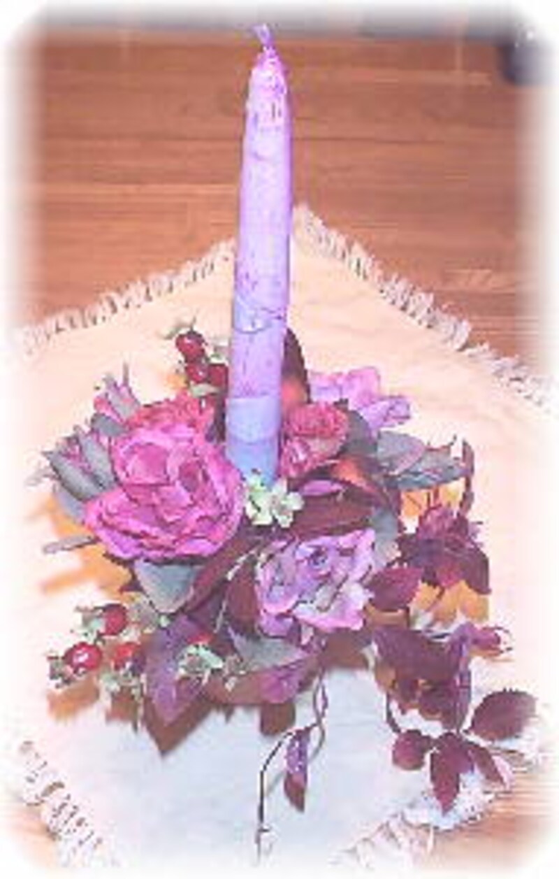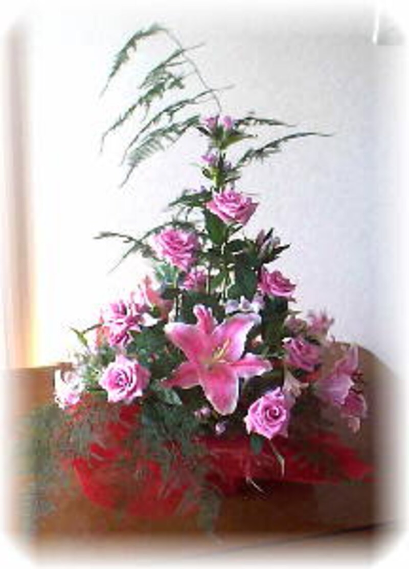紫のバラは、青みの強いピンクと考えてもよいでしょう。左はピンクの花とグリーンの配色。右はパープルの濃淡配色。フラワーアレンジメントでは葉っぱの色も重要です。