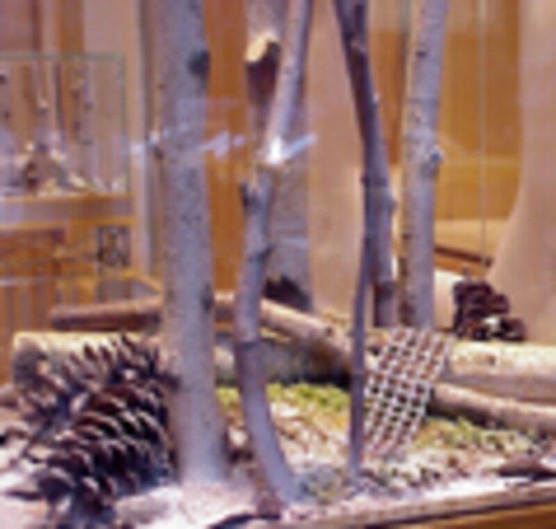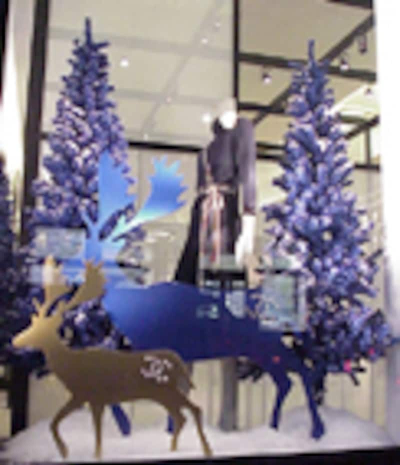 次は、高級ブランドのディスプレイを紹介。五番街に本店を構えるHARRY WINSTON(ハリー・ウィンストン)は小さなガラスのショーケースの中に枝を入れ、それにダイアモンドのジュエリーを飾りました。自然をイメージさせる小さな木立を背景に輝く大粒のダイヤ。ハリウッドや世界の王室などのセレブリティが夢中になるのもうなづける魅惑の輝きです。一方、ソーホーのCHANEL(シャネル)はブルーを基調にしたシックなディスプレイ。トナカイの背中にもしっかりシャネルマークが入っています。