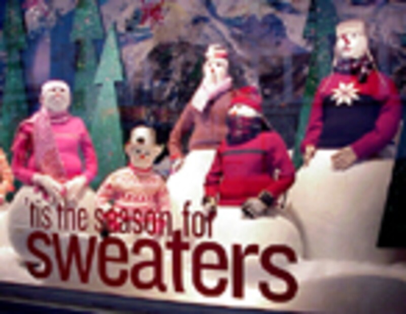 今年は暖冬のNYですが、さらに心暖まるディスプレイをしていたのはこの2つ。まずは、ソーホーのCynthiaRowley(シンシア・ローリー)。手前に置かれているのは、なんとヴォッカ用のセーター! ひと針ずつ手編みされたトナカイ柄とその可愛いアイディアに、ことても心和むディスプレイです。ヘラルドスクエアのOLD NAVY(オールド・ネイビー)。お馴染みGAPグループながら、さらに値段を押さえた品揃えが人気。ゆきだるまたちが着ているセーターも、ほとんどが10ドル台です。ウィンドーの中でくるくる回るゆきだるま一家、まさに家族で過ごす暖かいホリデーシーズンをイメージさせます。