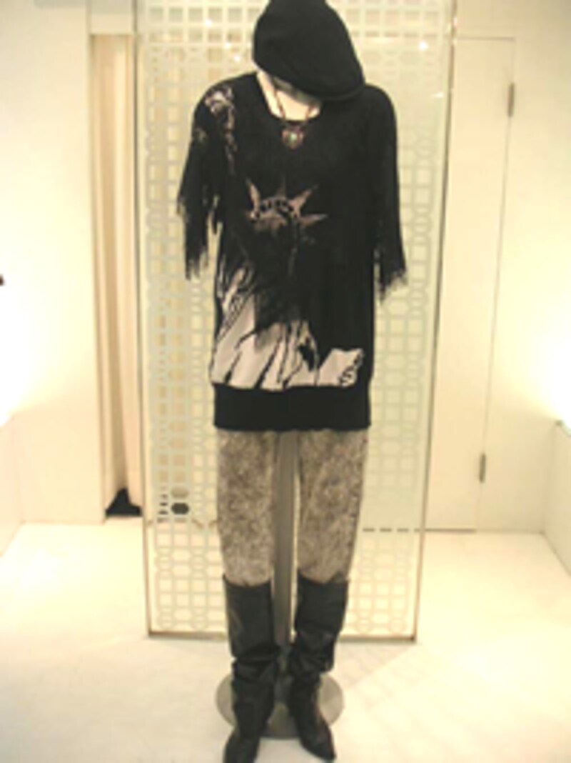ポイントはアンティーク風ネックレスとハンチング帽。上半身に視線を集め、スカル柄を際立たせる効果があります。