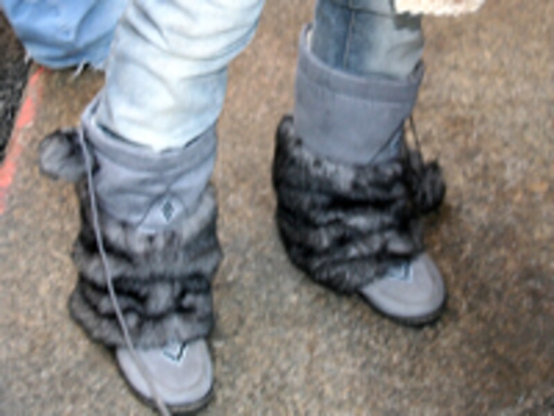 膝下にかなりのボリュームが出るので、トップスは今年のトレンド、ショート丈のジャケットでTシャツを重ね着させて。襟周りや裾にファーをあしらったジャケットと、足首のファーがロマンティックな印象を強調しています。ロゴ入りTシャツやロングマフラーにガーリーなテイストが漂います。